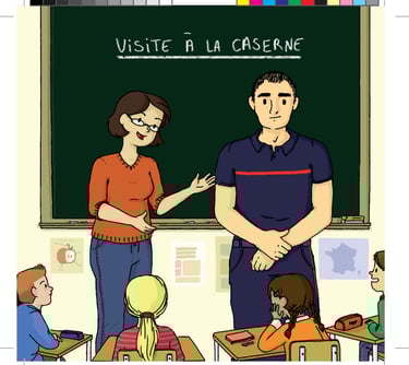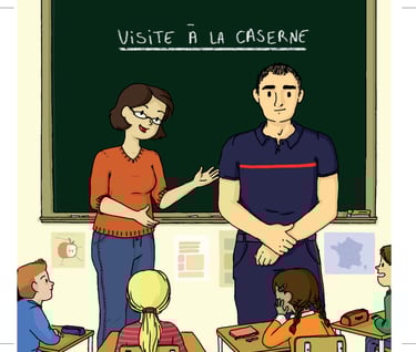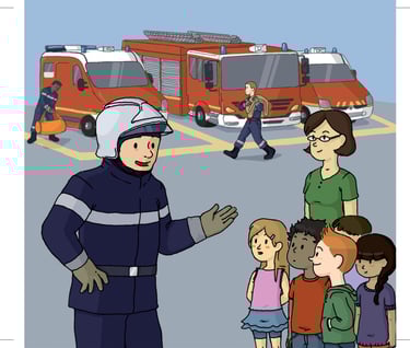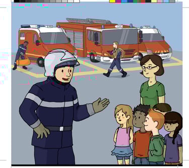 Notre Livre illustré décrit la visite d'un Pompier dans une classe pour décrire son métier, ses valeurs et son engagement envers les citoyens. il décrit aussi la visite d'enfants en caserne à l'occasion d'une sortie avec l'enseignant(e). Il dispense des conseils de prévention et sécurité à destination des petits, comment appeler les pompiers même d'un smartphone dont on a pas le code en cas d'urgence, alerter lorsque l'on ne voit plus la voisine âgée depuis plusieurs jours. Il contient aussi quelques jeux éducatifs, le diplôme du petit sapeur Pompier en herbe et bien d'autres choses.
